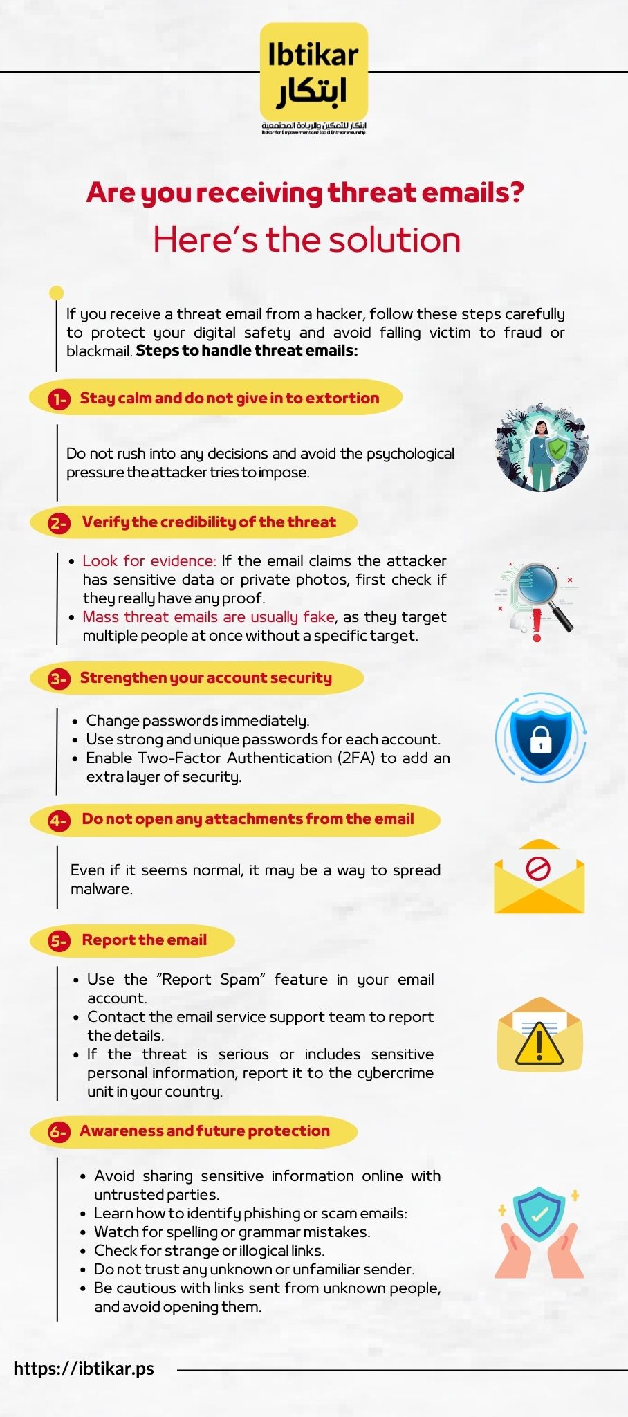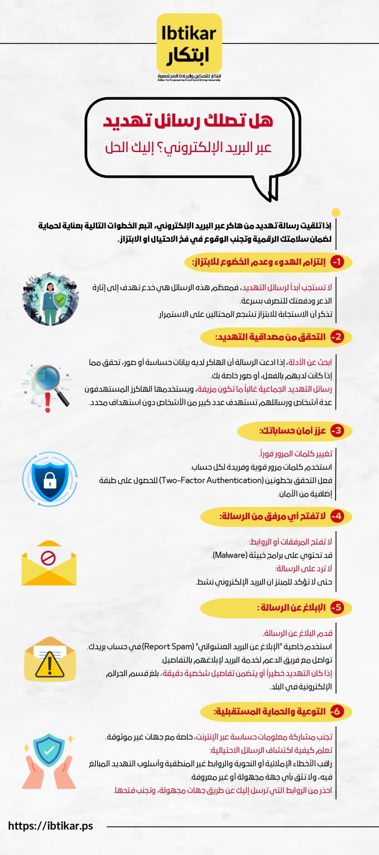 An informational guide on how cyber threats and extortion occur, legal consequences under Palestinian law, and essential prevention measures such as strong passwords, multi-factor authentication, regular updates, and data backups.